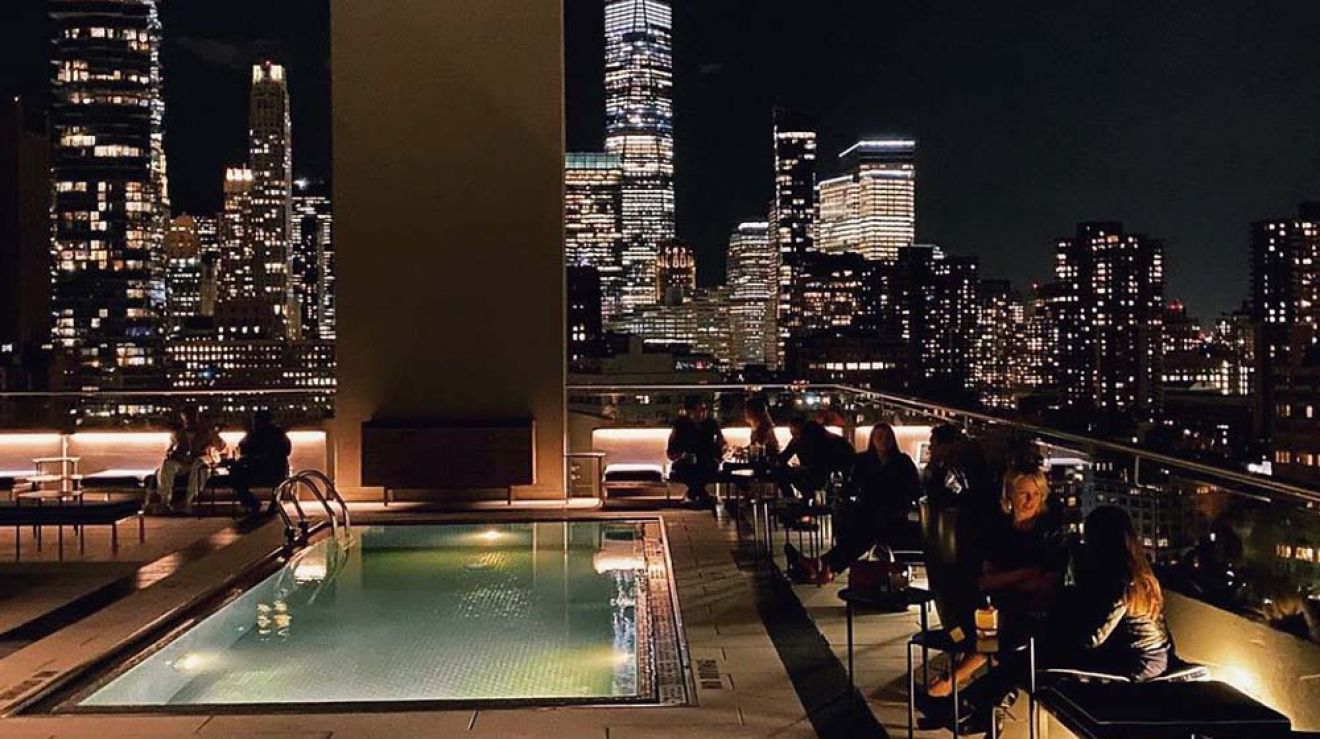A small but welcoming swimming pool sits at the center of a polished deck where one can sip a cocktail while enjoying unparalleled views of Wall Street, the Hudson River and the East River's iconic bridges.