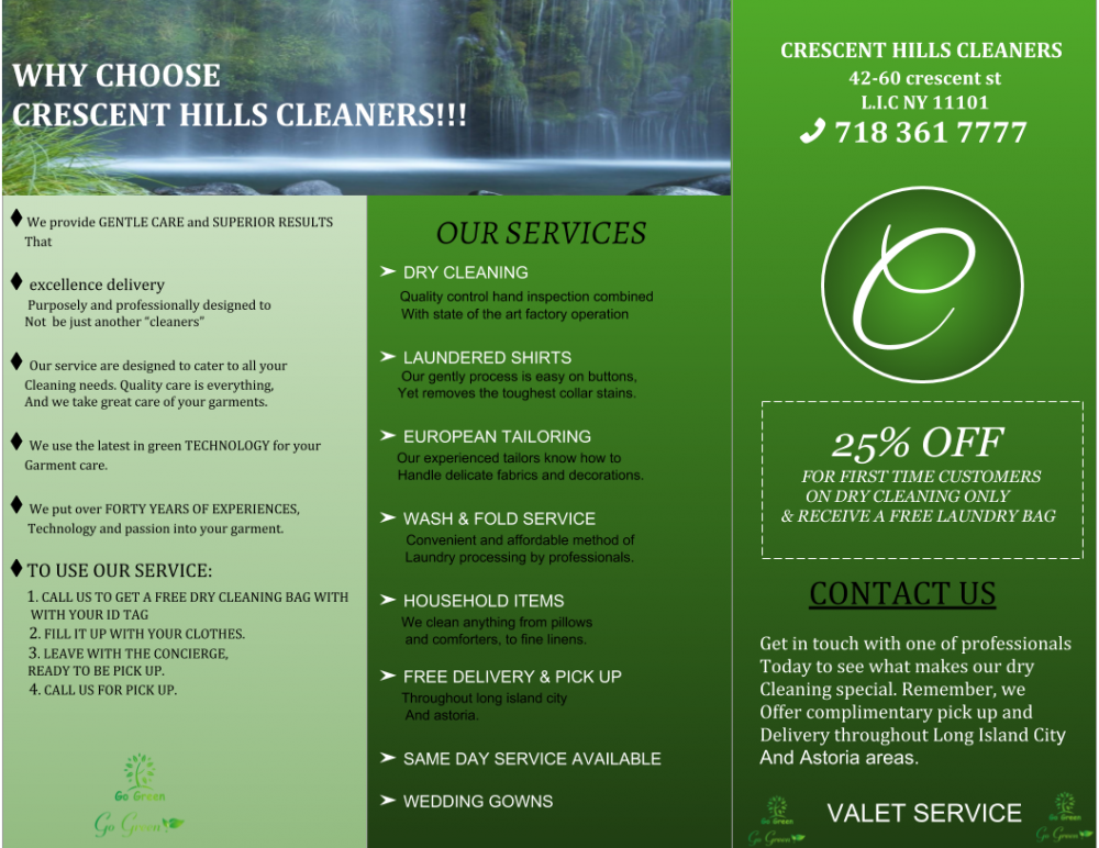 Why choose crescent? We use the lates in GREEN TECHNOLOGY for your garment care. We put over FORTY YEARS OF EXPERIENCE, technology and passion into your garments We provide GENTLE CARE and SUPERIOR RESULTS that your traditional dry cleaner would not. DRY CLEANING LAUNDERD SHIRTS WASH & FOLD SERVICE HOUSEHOLD ITEMS TAILORING FREE PICK UP & DELIVERY SAME DAY AVAILABLE User reviewsThere are no user reviews for this listing.